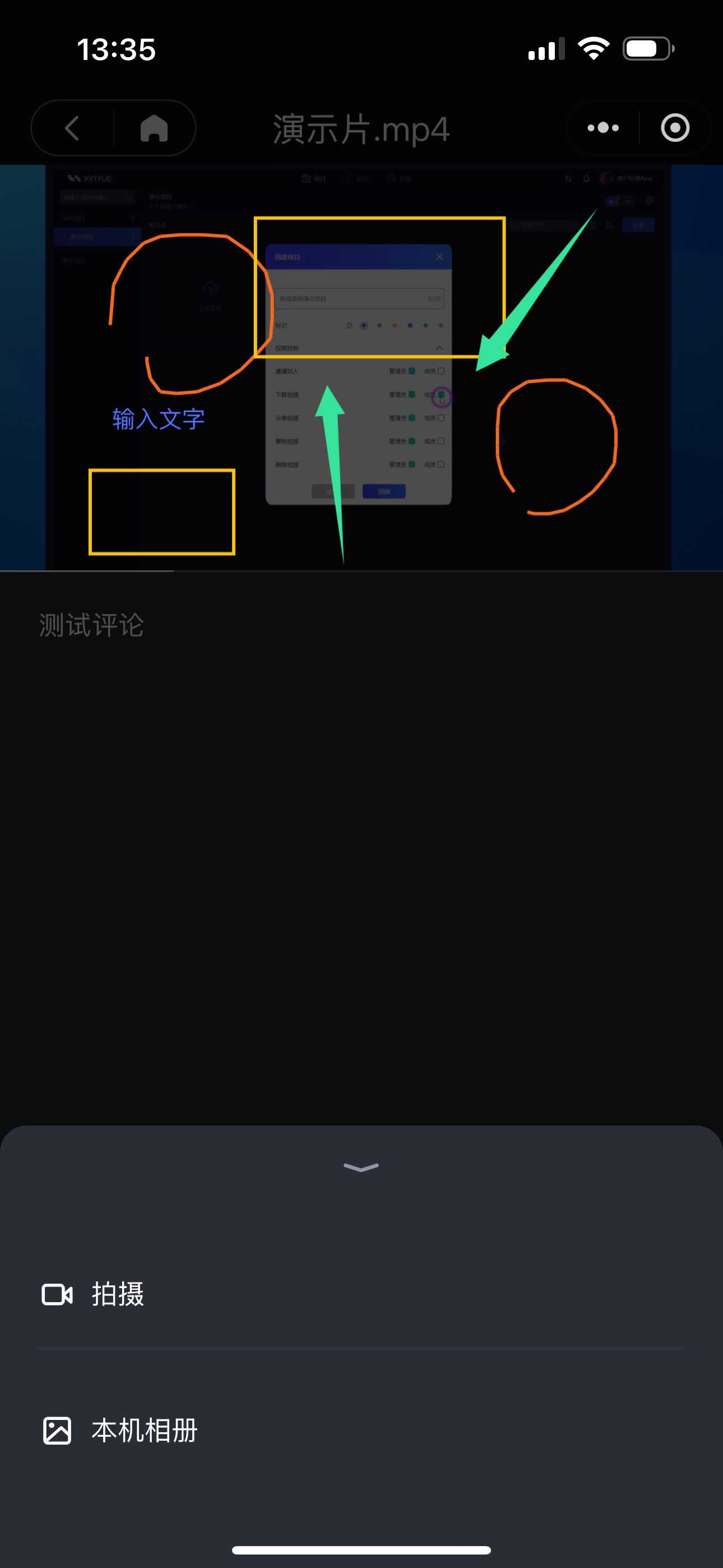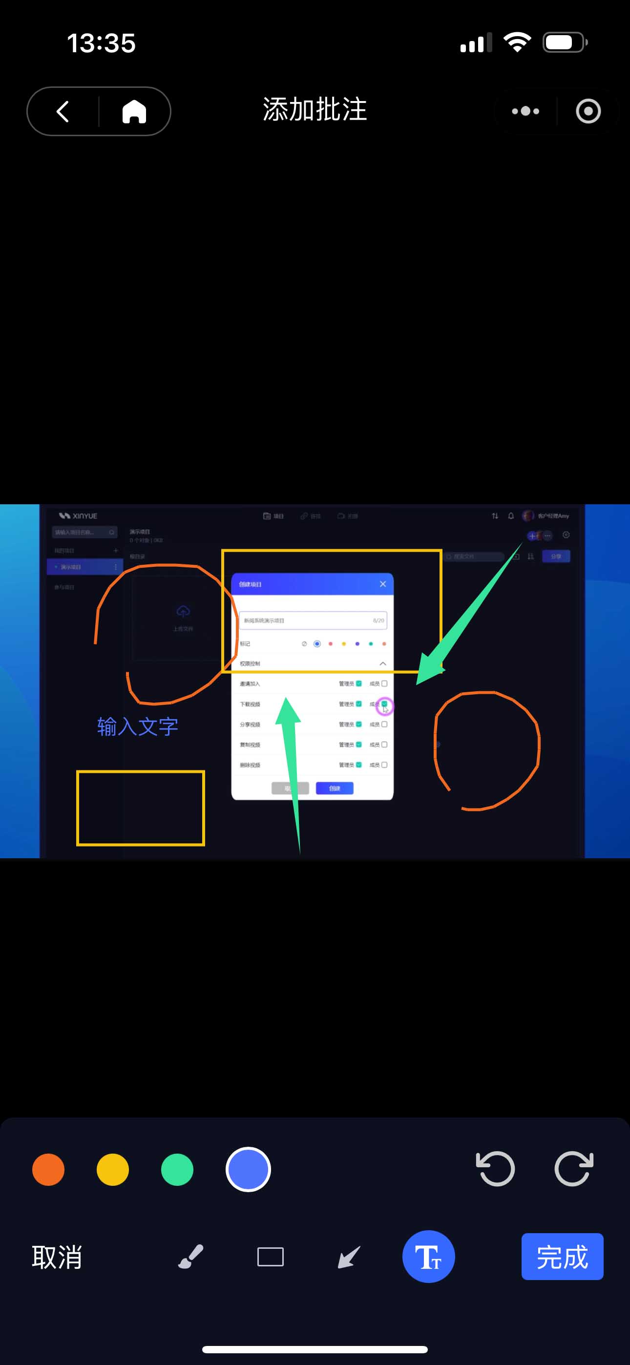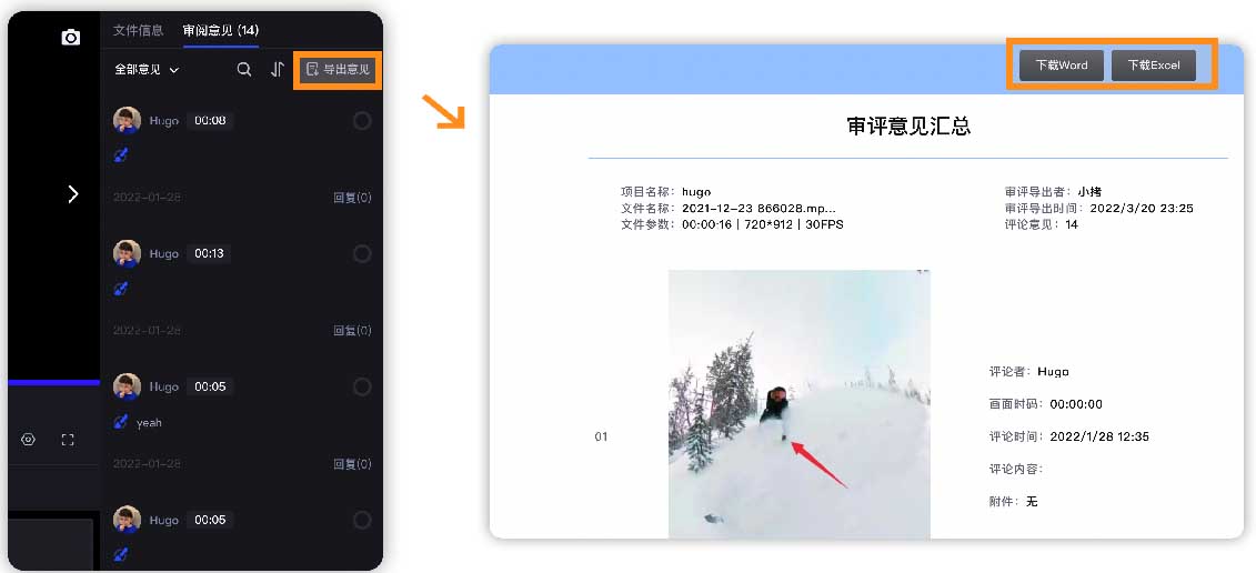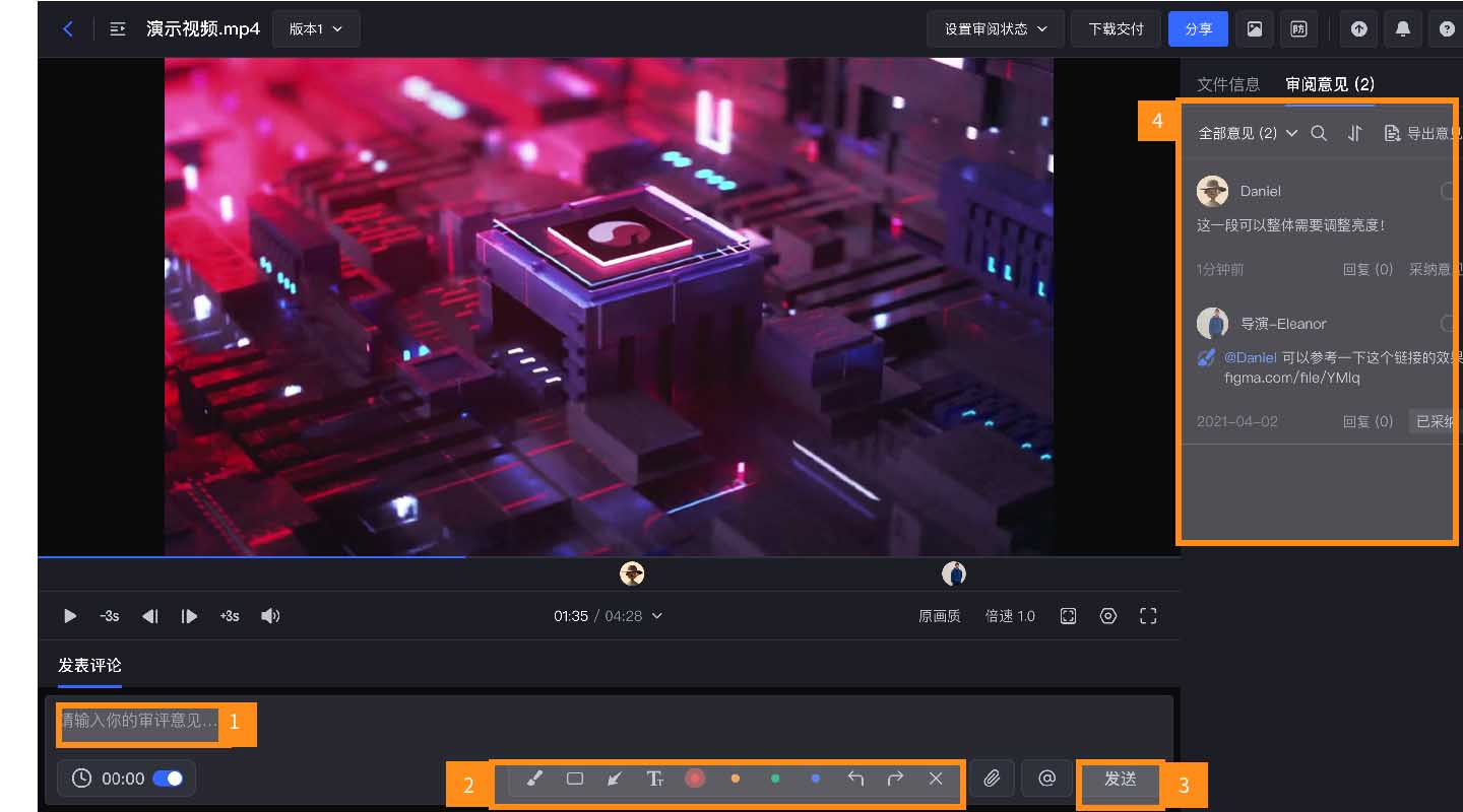• 支持【圈点画评论】,例如【画笔】、【方框】、【箭头】、【色彩】等工具,帮助直接在画面上进行涂鸦批注;也可以自由添加附件及文字综述,点击按钮发送评论