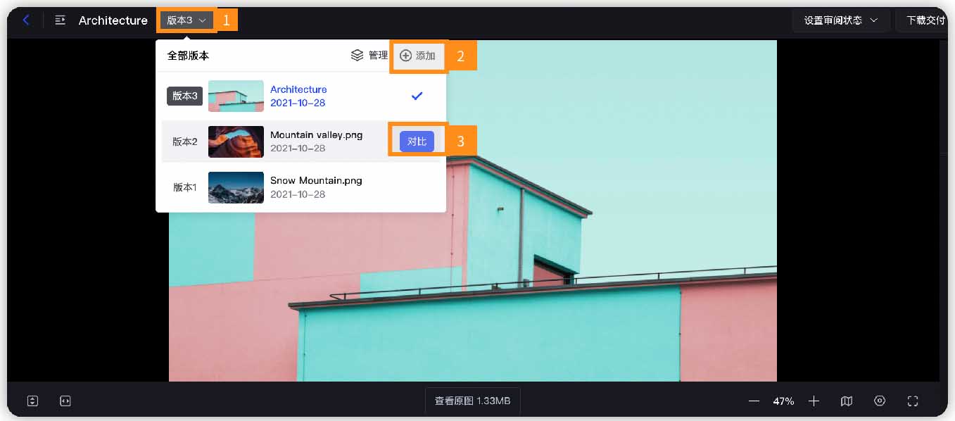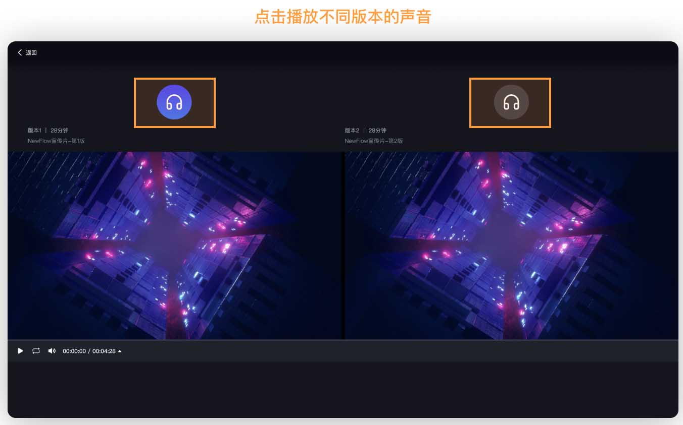 • 支持版本对比。选择带有版本的视频,打开版本,进入版本界面。在【版本】界面,单击任意版本文件的【对比】按钮,可以在对比界面同时观看两个视频的画面,更细致的比较差别;并支持选择任一声道播放,不会混音。