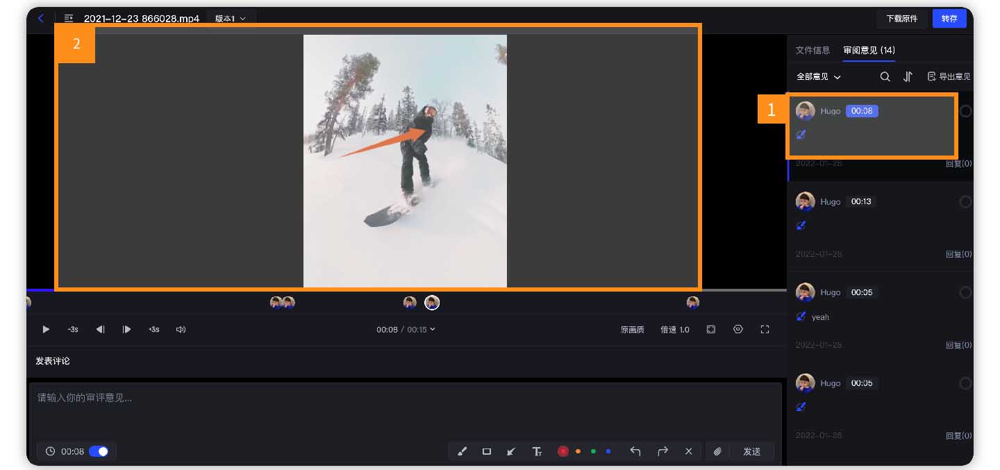 • 选择待评论画面。在项目界面单击视频文件进入审阅界面。选择要进行评论的时间帧,然后单击下方评论框,即可发表评审意见并发送,评论将自动展示到右侧评论区。