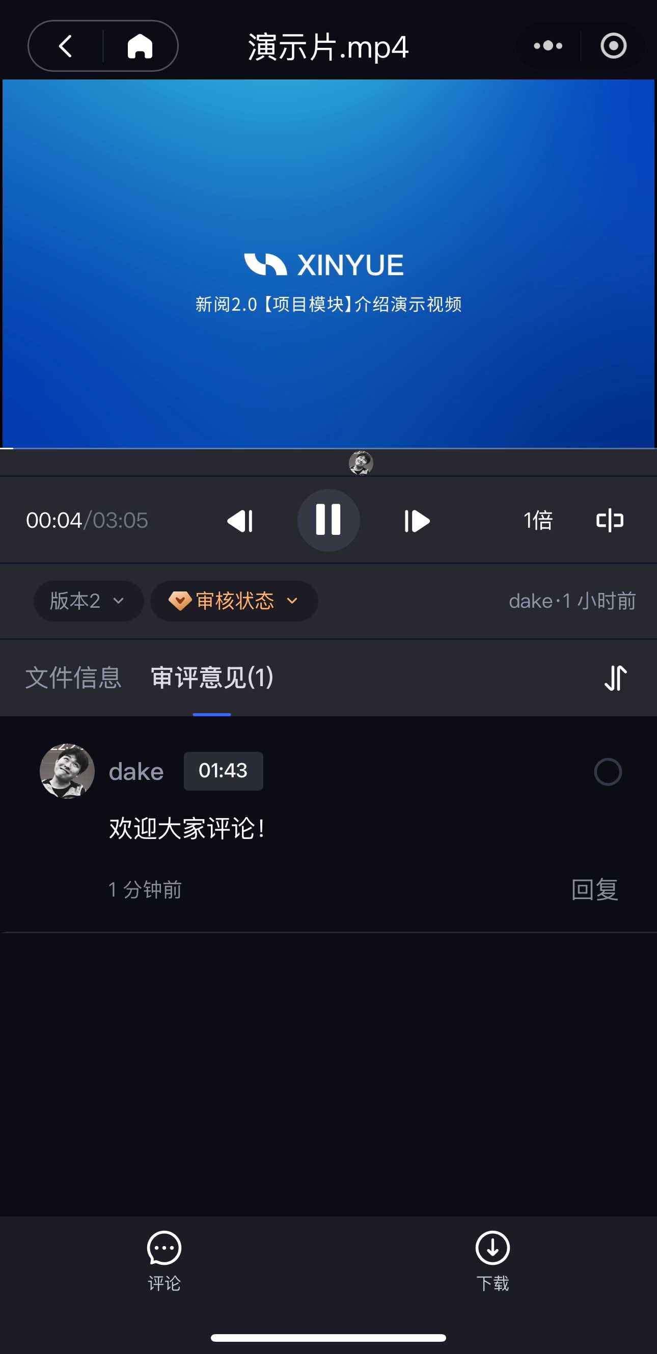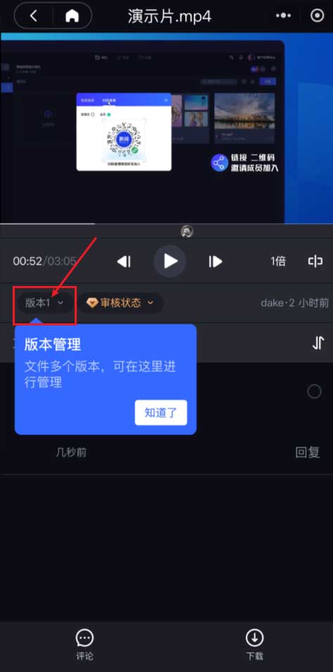• 在评论栏,可以看到成员和你进行的所有评论,并且你可以通过新阅在线【回复】沟通;单击此条评论,在左侧播放栏会自动跳转至对应时间帧。